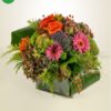Particolare bouquet con fiori stagionali dai toni rossi e arancio, germini rossi, nuntas e bacche.Ideale per augurare una buonissima giornata. La creazione verrà consegnata a mano dal fiorista personalmente al destinatario.