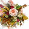 Bellissimo bouquet dai toni caldi con rose arancio e calle, con altri fiori autunnali di riempimento.