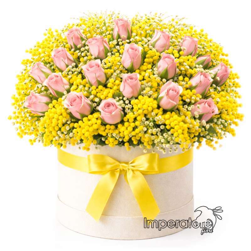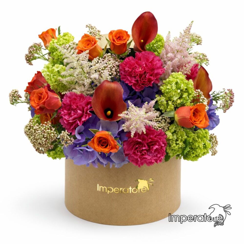 Packaging Naturale e Chic: I fiori sono disposti artigianalmente all’interno di una rigorosa cappelliera in colorazione kraft/avana, impreziosita al centro dall’elegante logo dorato lucido “Imperatore”. Un contrasto perfetto tra la semplicità del cartone naturale e la ricchezza lussuosa dei fiori.