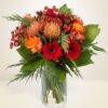 Bellissima composizione in vaso di vetro con gerbere rose e altri fiori di riempimento autunnali, ideale per donare un tocco di colore. Perfetto per auguri, anniversari, congratulazioni e ringraziamenti. La creazione verrà consegnata a mano dal fiorista personalmente al destinatario.