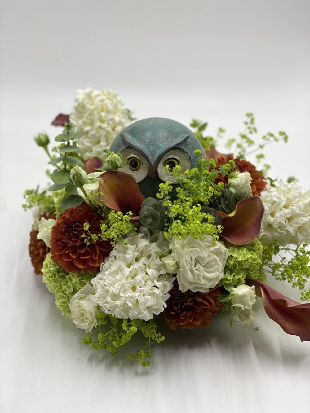 composizione con gufetto e fiori misti