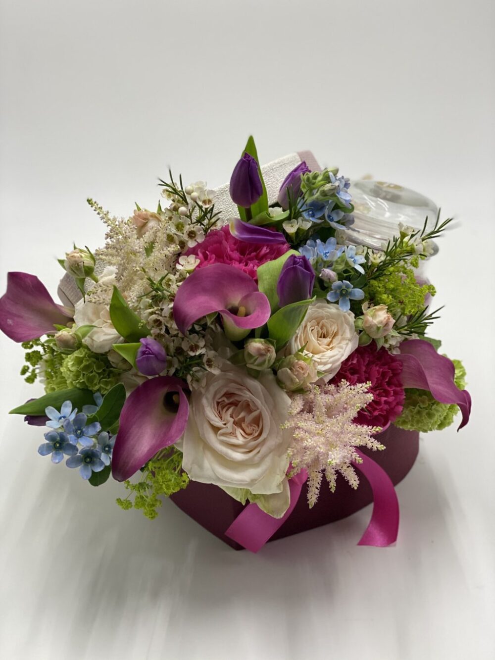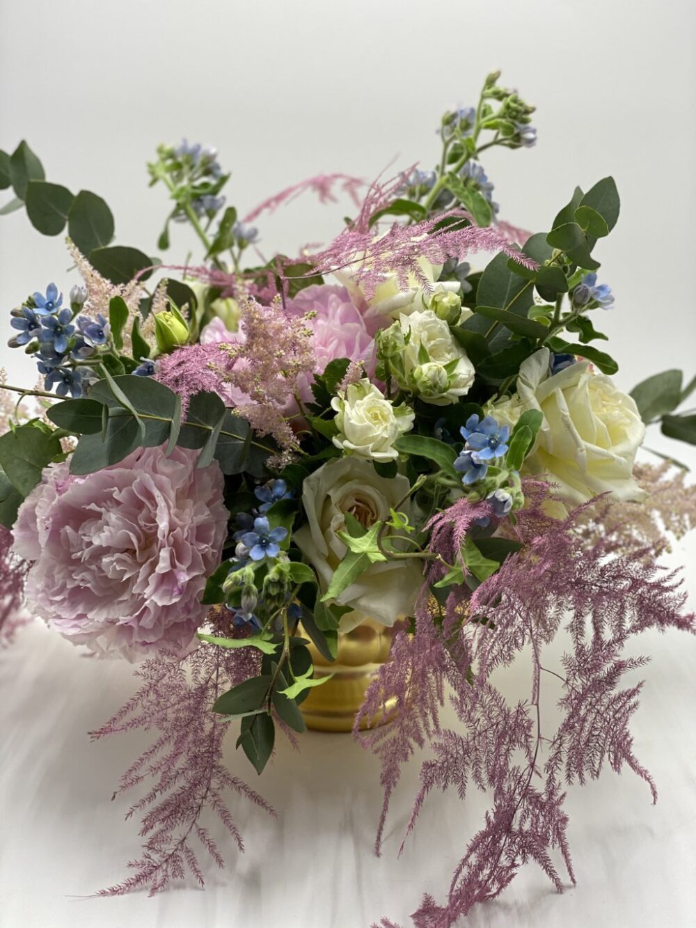 composizione di ortensie,rose e eucalipto dai colori pastello con vaso ceramica