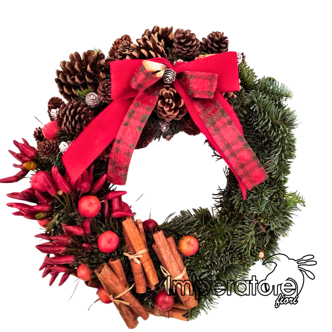 La coroncina fuoriporta natalizia con decorazioni naturali è la scelta ideale per dare il benvenuto alle feste con calore e stile. La base in abete regala volume e profumo, mentre pigne selezionate, bacche rosse e stecche di cannella aggiungono un carattere autentico e artigianale. Il fiocco rosso rifinisce la composizione con una nota classica che si abbina facilmente a lucine, candele e agli altri addobbi della casa.