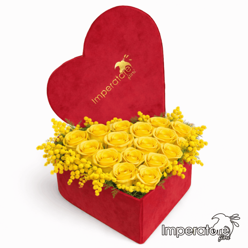 Esplosione di Colore: All’interno, il giallo solare delle Rose e della Mimosa crea un contrasto vibrante con il rosso della box. È un abbinamento che cattura subito lo sguardo e trasmette positività.