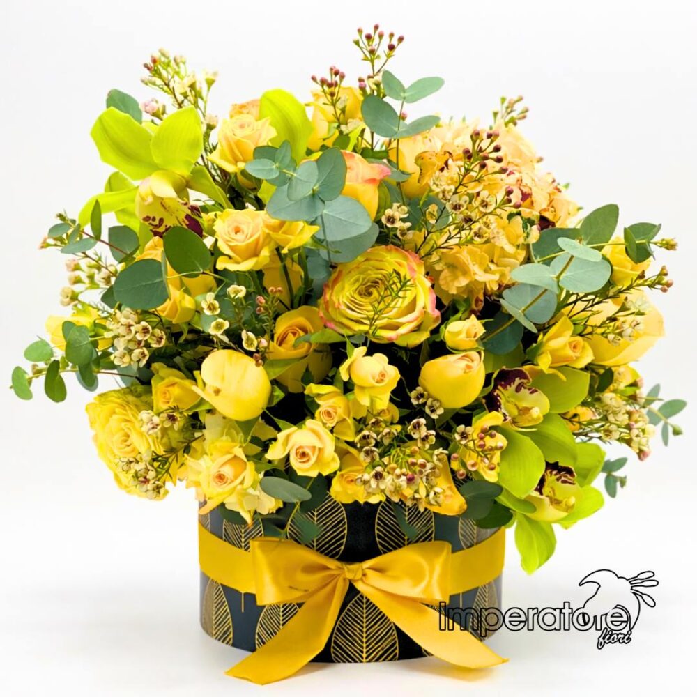 Packaging d’Autore: I fiori sono disposti in una raffinata cappelliera (hat box) nera, decorata con una moderna trama a foglie dorate e chiusa da un grande fiocco in raso giallo brillante.