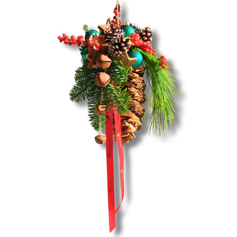 Porta a casa il calore delle feste con questa pigna natalizia da appendere. È una decorazione fuoriporta naturale, curata e d’effetto. La base è una grande pigna. Attorno trovi rami di conifera dal verde intenso, bacche rosse luminose e campanelli dal suono discreto. Un nastro rosso lungo e lucido rifinisce il tutto. L’insieme è elegante, caldo, immediato.