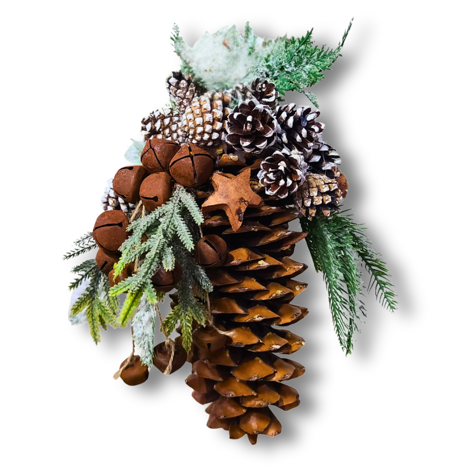 Porta a casa l’atmosfera del bosco con questa pigna natalizia da appendere: un addobbo curato nei dettagli che unisce il calore del legno alle note invernali del verde. La composizione è costruita su una pigna grande con finitura naturale, arricchita da mini pigne innevate, campanelli decorativi e rametti di abete/conifera che donano volume e movimento. Al centro spicca una stella di anice che aggiunge carattere artigianale alla creazione.