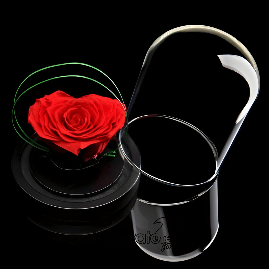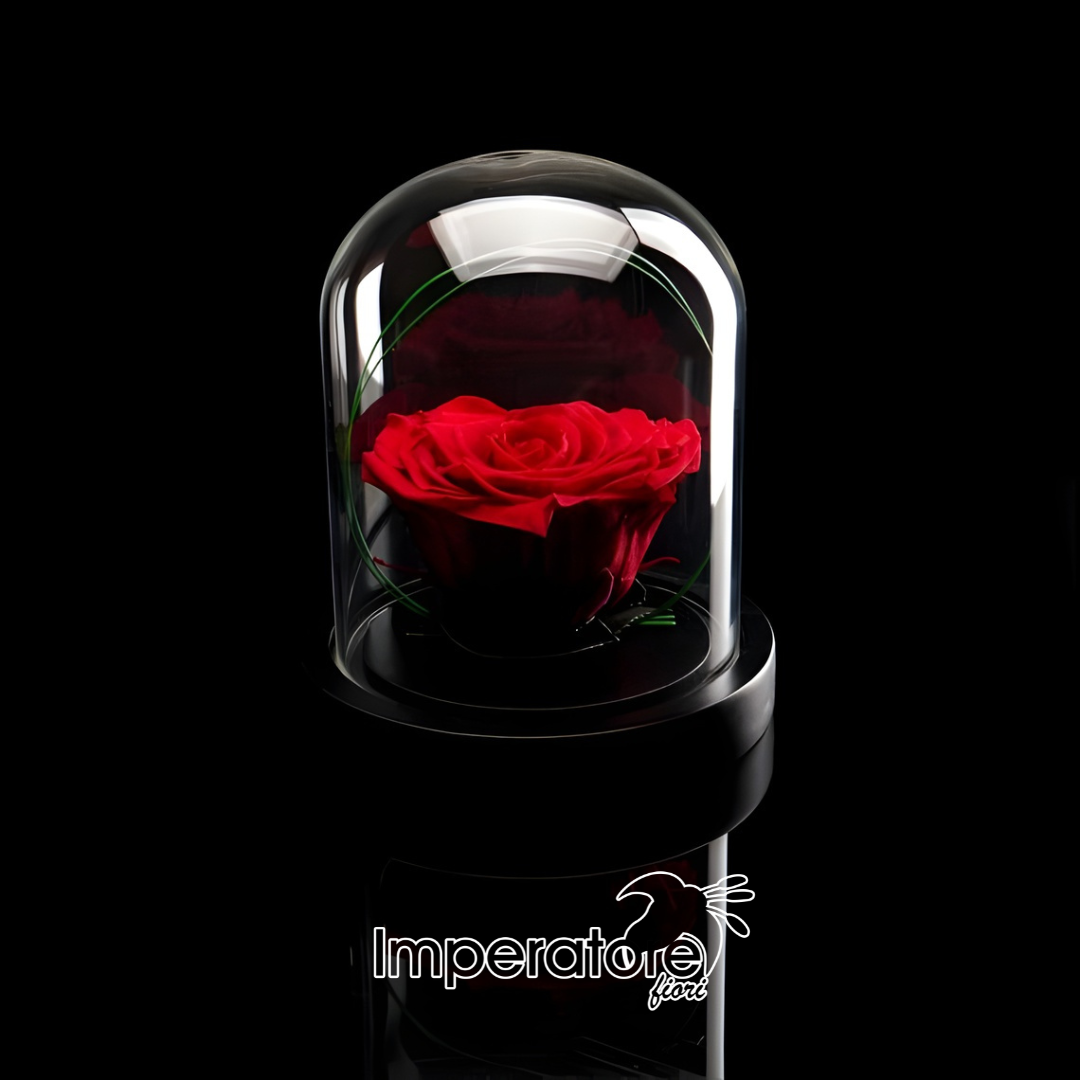 All’interno della cupola con base elegante, la rosa rossa assume l’iconica forma di cuore, simbolo universale d’amore. Non necessita di acqua né di particolari cure: basta tenerla lontana da sole diretto, fonti di calore e umidità e, soprattutto, non bagnarla. In questo modo, conserverà il suo fascino per anni, trasformando ogni ambiente in un piccolo scrigno di emozioni.