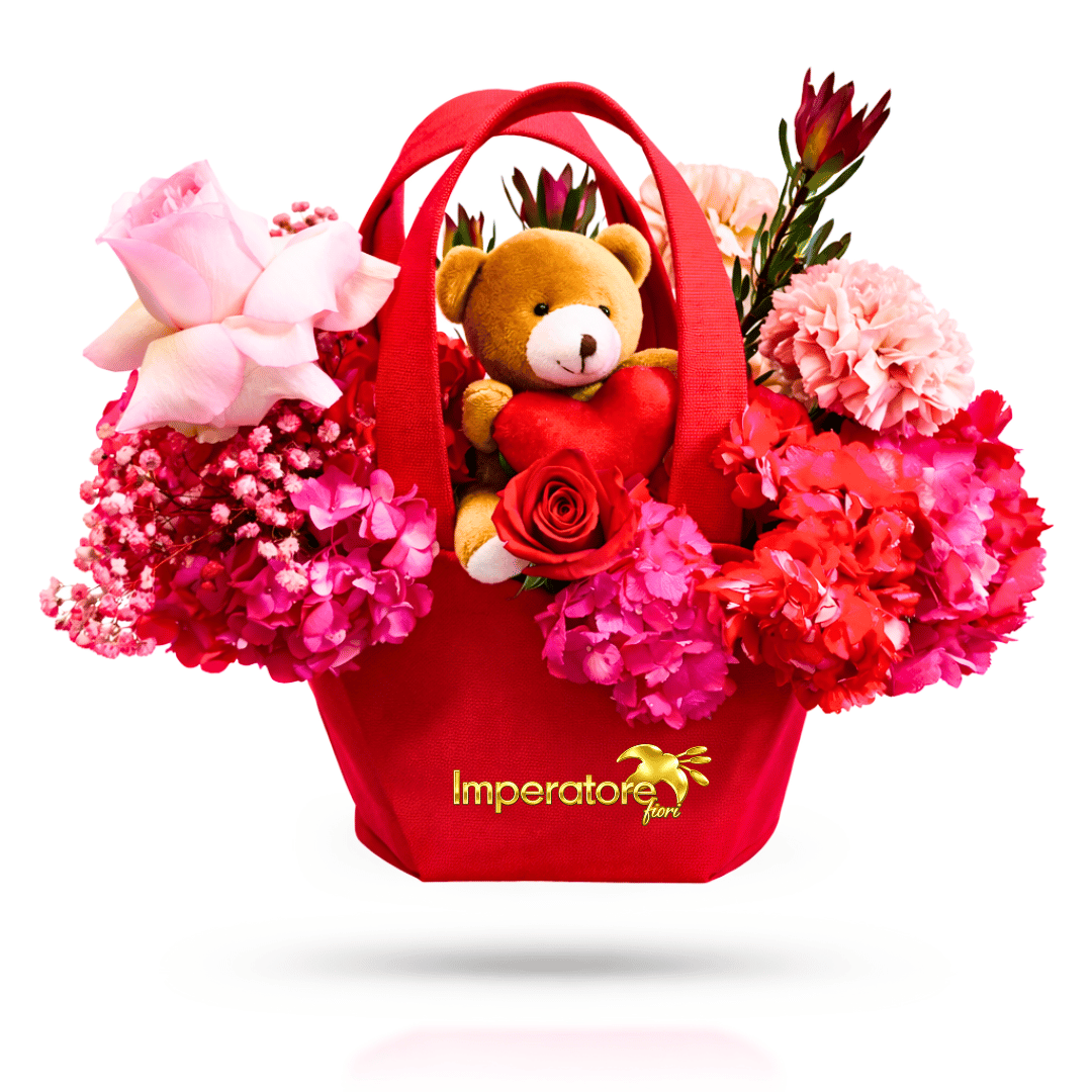 Design “Prêt-à-porter”: La composizione è realizzata all’interno di una graziosa borsetta in tessuto rosso con manici e logo dorato “Imperatore Fiori”. È comoda da trasportare, bellissima da esporre e la borsa può essere riutilizzata come ricordo.